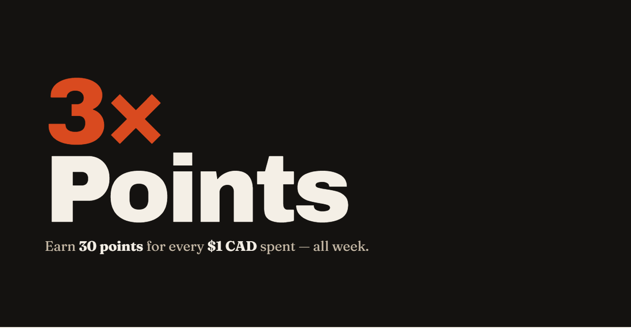 Every order = 30 points per $1 CAD (normally 10). Stack 'em for free shipping, dollars off, or Dents & Dings deals.