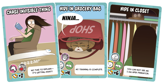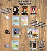 Based on the Pizza Cake Webcomic, players are cats, drawing 4 CAT CARDS per round and play them to annoy the human! you take turns playing as many cat cards with a matching mischief mark under the human cards that you want. Whoever has the highest cat card score wins that human card. The first player to win 5 human cards first wins (gets food)