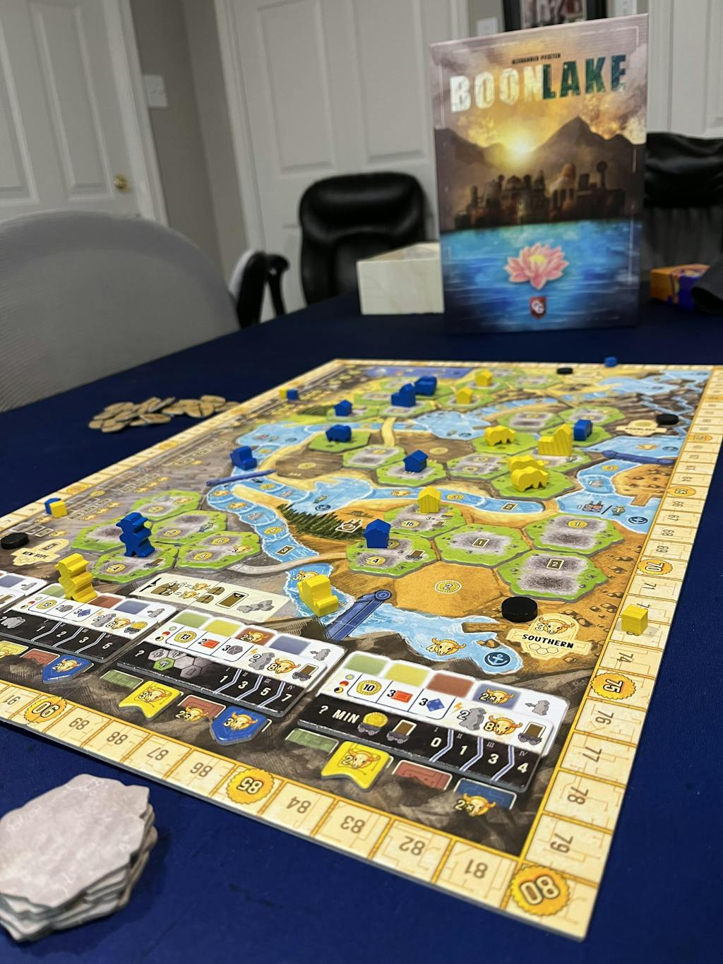 Boonlake is an expert game in which you are finding yourself improving your life — and your group's life — in this new territory...but how you accomplish this is completely up to you! Due to a novel action mechanism, each game progresses differently. Each action needs to be considered carefully since the other players also benefit from the action you choose. Besides this, the action determines how far you may move your ship — the further and faster, the better!