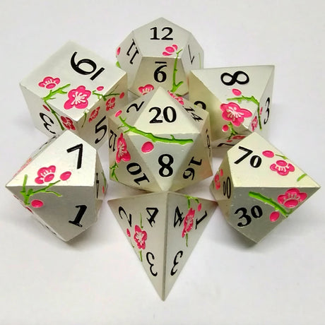 Plum Blossom Dice Kit - Silver with Pink Flowers in a Metal Box