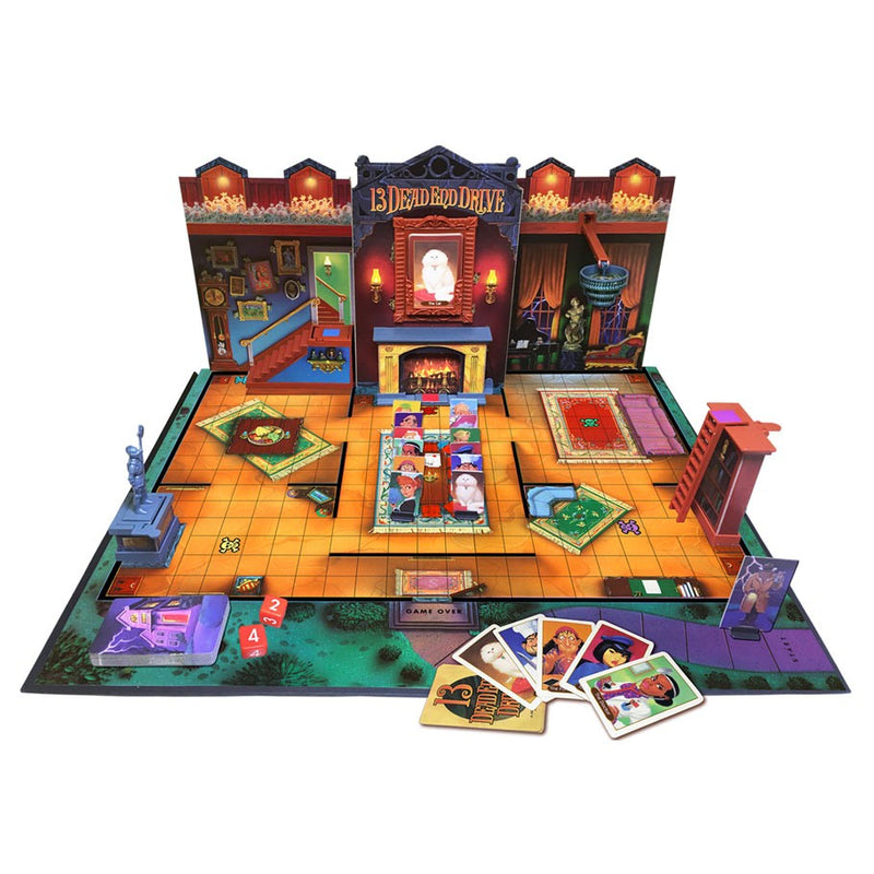 The portrait above the fireplace contains cards for each character plus Aunt Agatha. When you roll doubles, you may change the portrait.