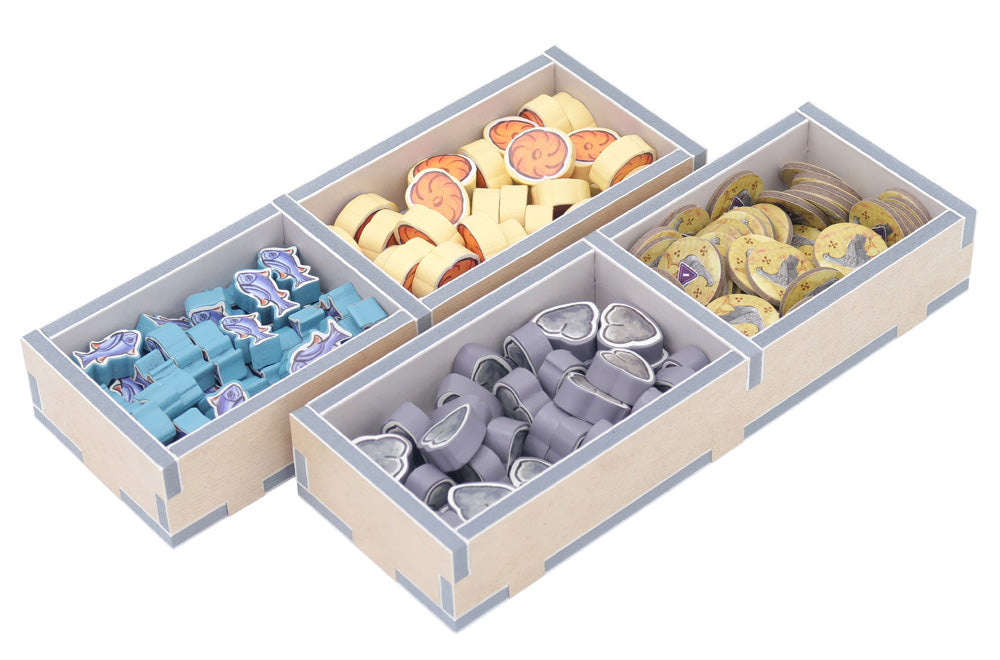 The insert includes trays for storing and organizing all of the game components. There is space for all cards to be sleeved with quality sleeves. Each player receives their own player tray colour matched to the player pieces.