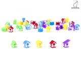 The product includes a set of 8 tokens in each of the 5 colors (yellow, blue, red, purple, green) to replace the full set of action markers in the game.