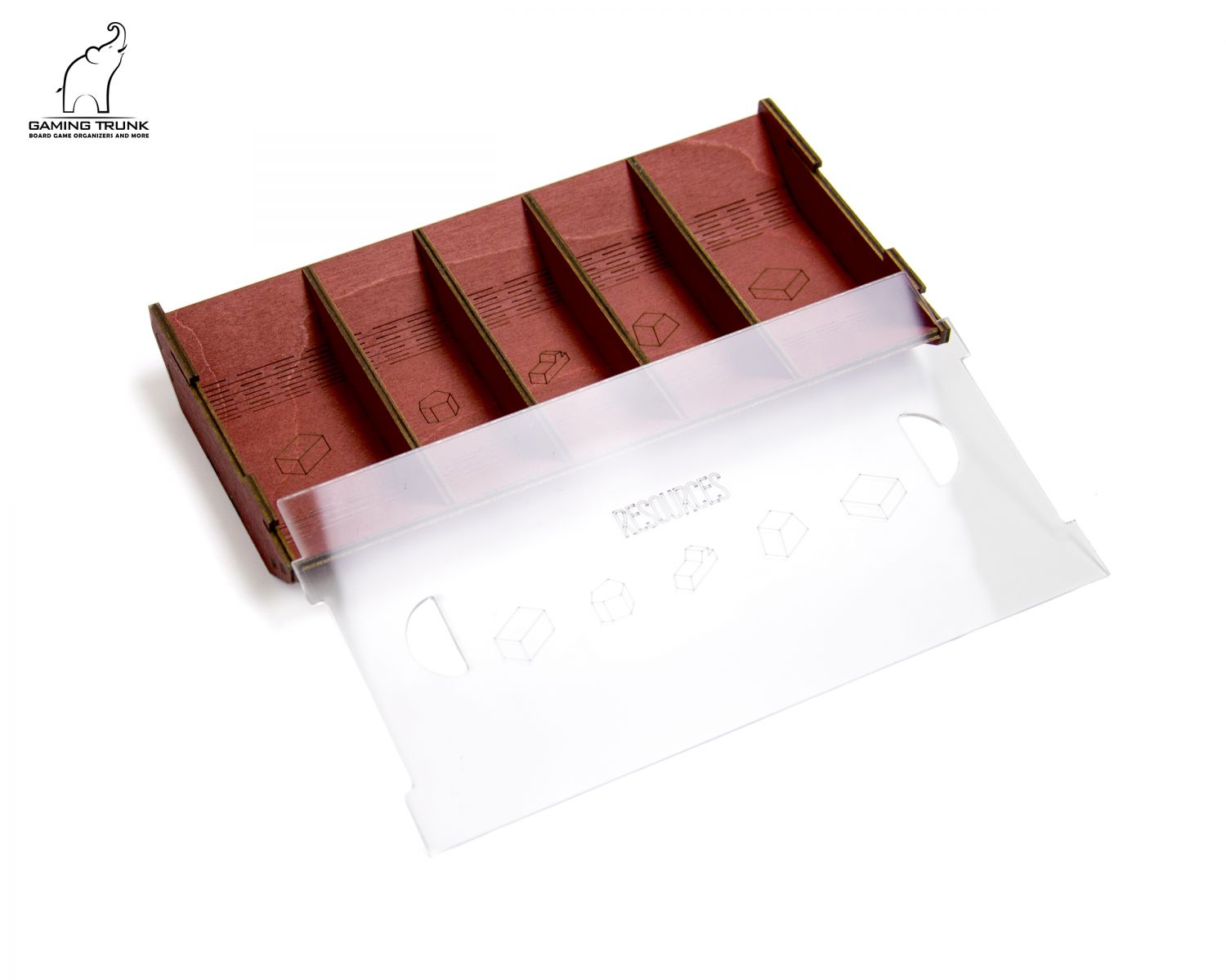 The tokens tray stores resources tokens. A clear plastic lid keeps the tokens in place and the curved tray bottom ensures easy access to the tokens. Engravings on each section of the tray help identify token locations after the game.