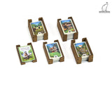 Five card trays store Bonus cards, Quadrant cards, Point cards, 1 deck of Gateway cards, and 1 deck of Farmyard cards. These trays can be placed on the action board or beside it to keep cards organized during the game. It will be beneficial for faster set up to keep your favorite decks of Gateway and Farmyard cards in these trays.