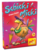 Schicki Micki is a card game for larger groups (up to seven players), where players with fastest reaction win. The cards show almost identical (female) pheasants, drawn in comic-style. One player takes the shuffled deck and reveals one card after the other. If a player detects a clothing piece on two cards with the same color, they shout the correct name of the clothing piece. If there are more than one corresponding clothing tiles, a pawn must be taken instead. The pheasant ladies also have pets, normally it's one earthworm. Some cards have two worms, if these occur, the players have to knock onto the table. Only player doing the right thing in the right time win the cards already on the table; if they're wrong, they lose cards. After all cards are revealed the game ends, the player with most cards collected wins.