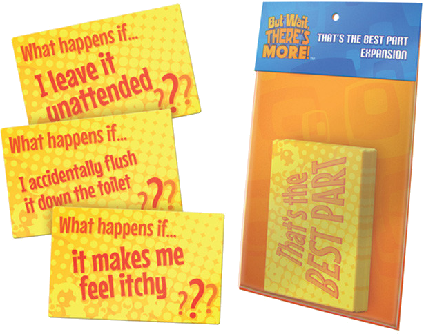 Are you such an expert pitchman that you can sell ice (that attracts beautiful butterflies all summer long) to Eskimos? Then the But Wait, There's More!: That's The Best Part! expansion for you! Every good pitchman lets his audience ask questions, and that's precisely what this expansion adds!