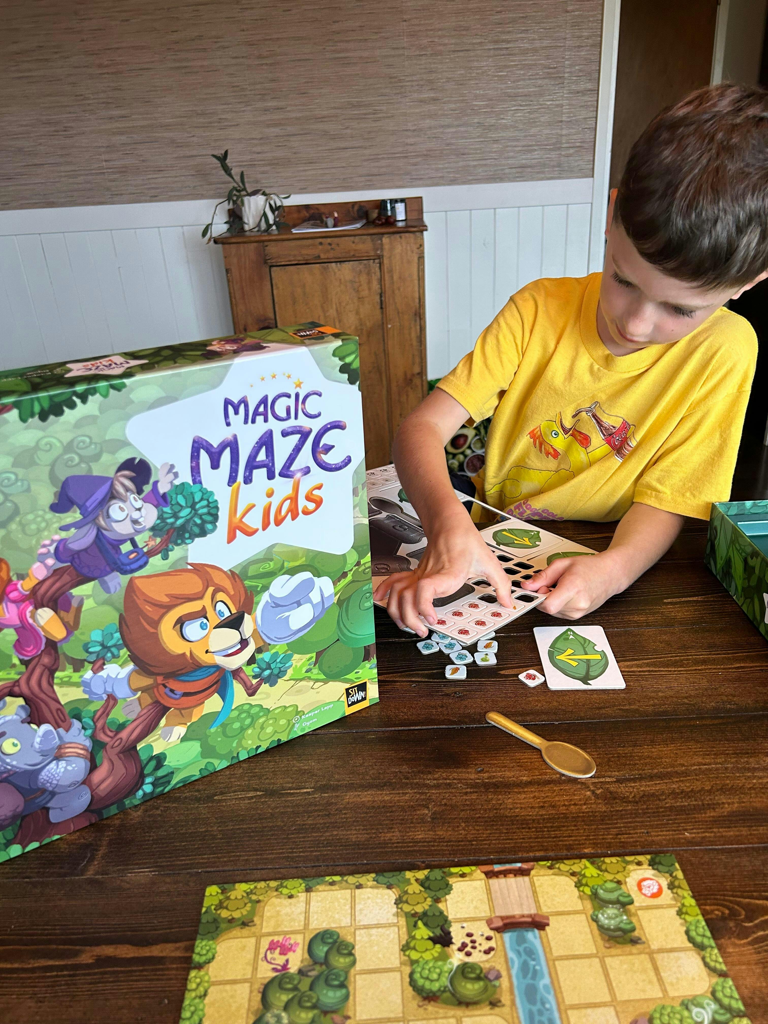 Magic Maze Kids is a cooperative game that makes the original mechanisms of Magic Maze accessible to young players. Everyone controls all of the heroes, but only in one direction! Tutorials gradually teach you the rules, and several levels make the game evolve with the children.