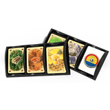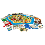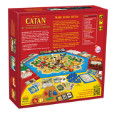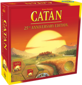 Catan: 25th Anniversary Edition contains the Catan base game, the Catan: 5-6 Player Extension, the Helpers of Catan scenario, special iridescent anniversary wood pieces and dice, resource card sorting trays, and card sleeves.