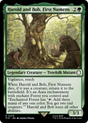 When Harold and Bob, First Numens dies, if it was a creature, return it to the battlefield. It's an Aura enchantment with enchant Forest you control and "Enchanted Forest has '{T}: Add three mana of any one color. You get two rad counters."" Harold and Bob loses all other abilities.