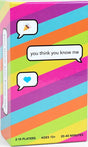 You Think You Know Me playfully tests how well you know your friends, giving you a chance to learn more about what they love and who they are. Each player starts with seven cards in hand, cards that say things like "I know that your secret talent is ________" or "I know that you would/wouldn't want to live forever." On a turn, you pick another player, play a card from hand, and say how you think they would answer the question. If you're right, you discard the card; if not, you have to draw a new card and add it to your hand. Whoever first discards all their cards wins.