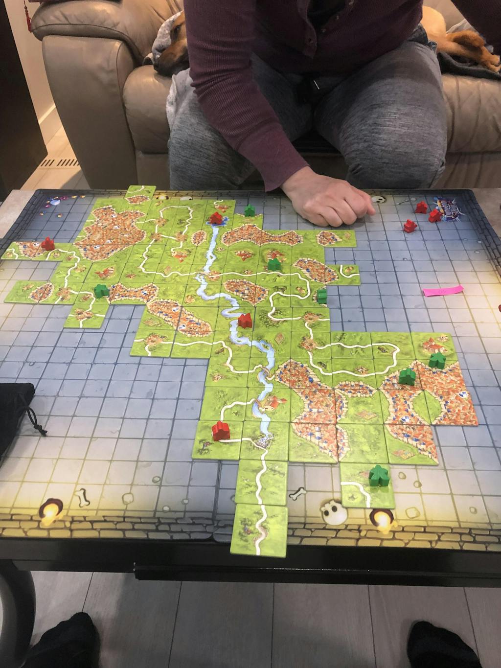 Carcassonne is a tile-placement game in which the players draw and place a tile with a piece of southern French landscape on it. The tile might feature a city, a road, a cloister, grassland or some combination thereof, and it must be placed adjacent to tiles that have already been played, in such a way that cities are connected to cities, roads to roads, etcetera. Having placed a tile, the player can then decide to place one of his meeples on one of the areas on it: on the city as a knight, on the road as a robber, on a cloister as a monk, or on the grass as a farmer. When that area is complete, that meeple scores points for its owner.