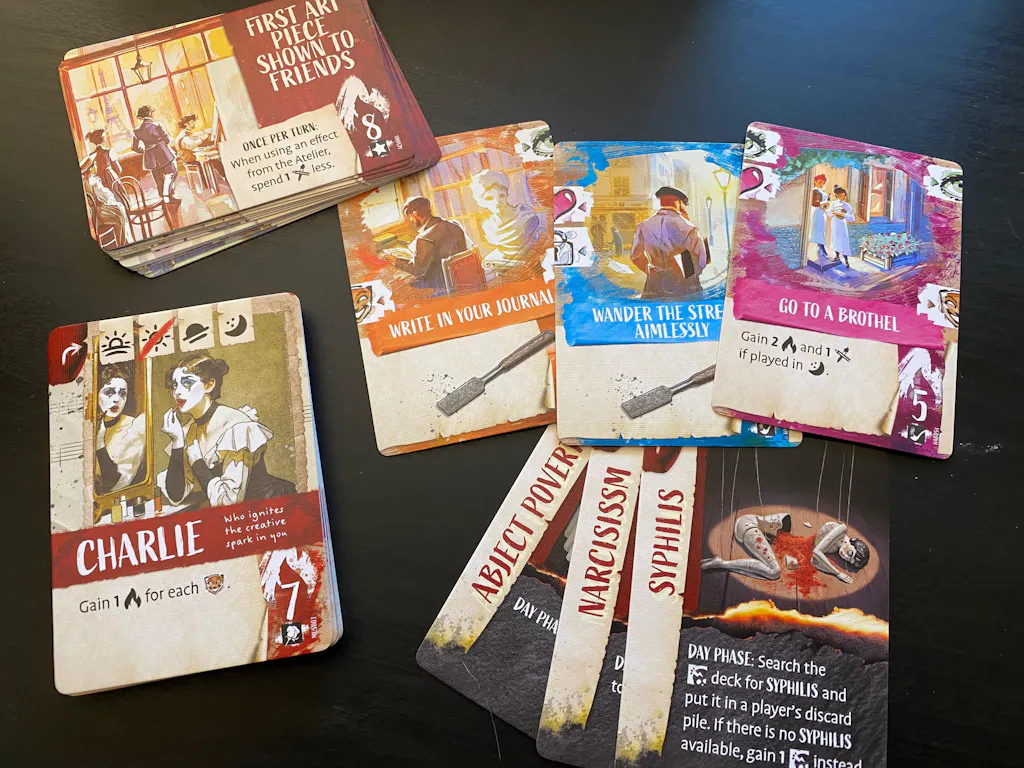 In Bohemians, players take on the roles of artists wandering the streets of Paris at the turn of the 19th and 20th centuries, striving to create masterpieces while facing the challenges of daily life. Bohemians is a card-driven game in which players collect cards to find inspiration, seek muses, and manage everyday necessary tasks.