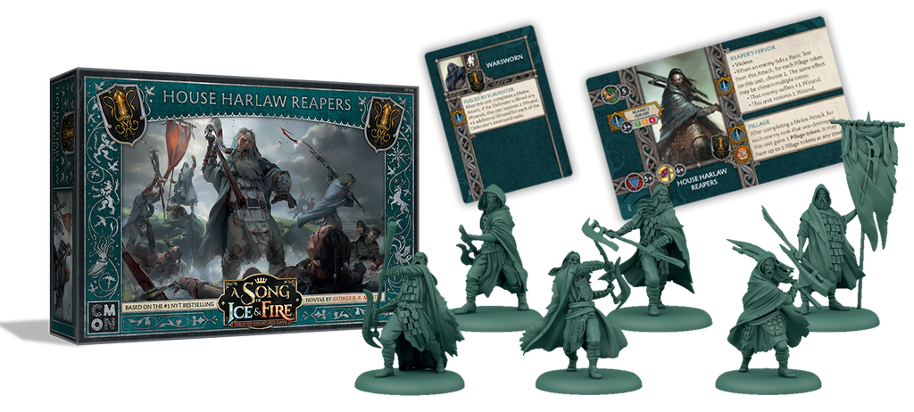 The House Harlaw Reapers unit box for the A Song of Ice and Fire: Tabletop Miniatures Game gives House Greyjoy players a melee-focused unit for their army. The Reapers wade into battle with their scythes, dealing massive amounts of damage as they go. But as they reap, so too do they sew. Sew chaos among the enemy ranks, anyway. Foes do not like standing against these gruesome soldiers. The set also comes with the Warsworn Unit Attachment that will make taking out enemy ranks and units even more rewarding.