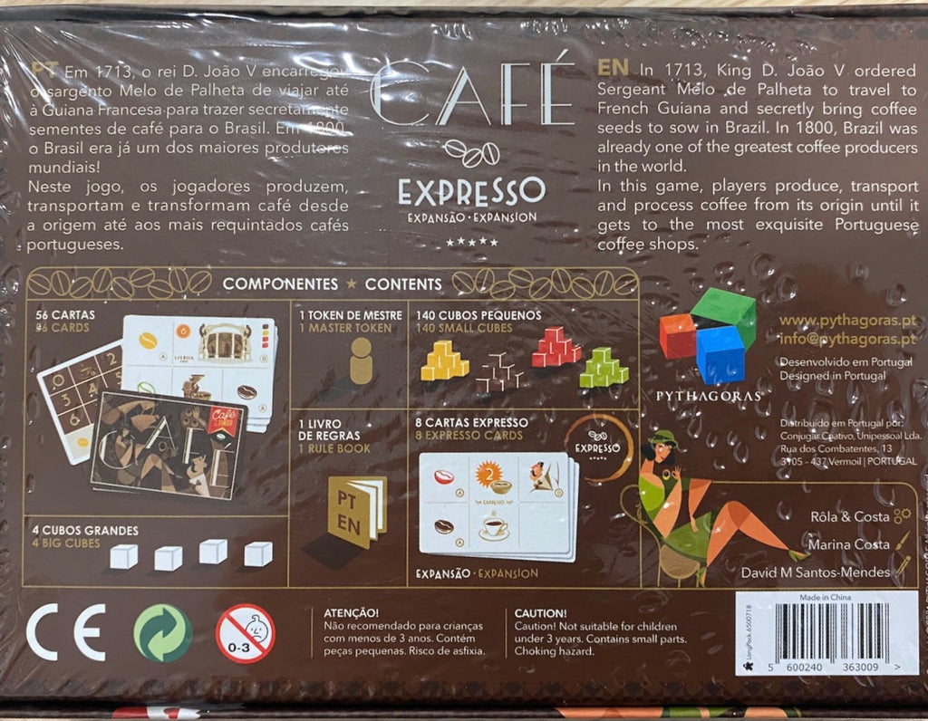 In Café, 1 to 4 players represent coffee companies, that from plantation, aging, roasting and distribution, try to create and control the best supply chain of coffee.
