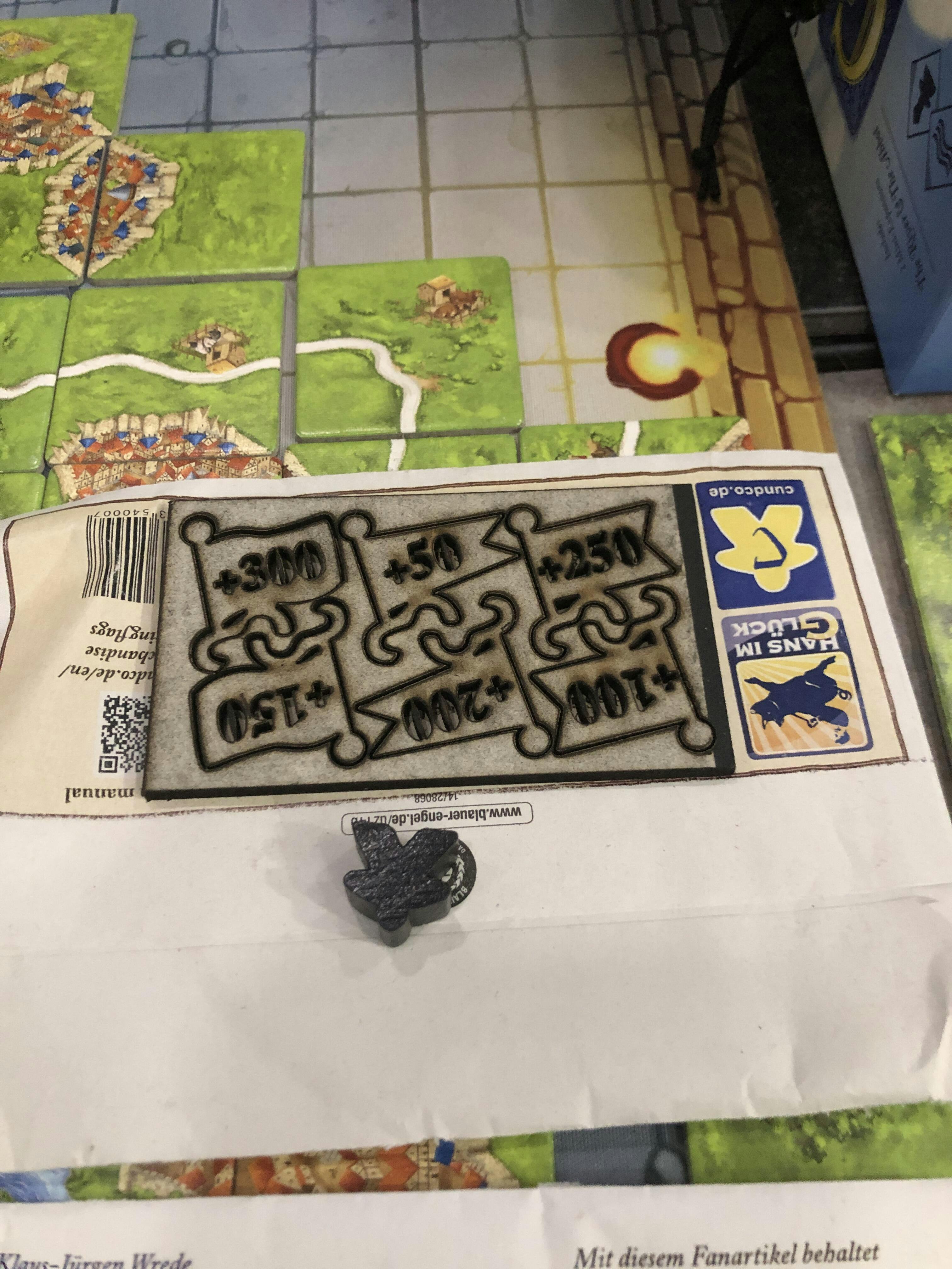 Contents: 6 laser-cut scoring flags (50, 100, 150, 200, 250 and 300), 1 counting meeple, 1 rule