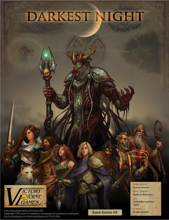 Darkest Night, by designer Jeremy Lennert, is a fully-cooperative board game for one to four players (up to six with variants), set in a kingdom broken under a necromancer’s shadow. Each player takes on the role of one of the kingdom’s last heroes (nine playable characters), each with a unique set of special abilities, just as they hatch a plan to save the realm.