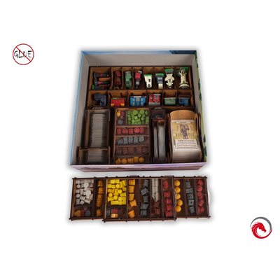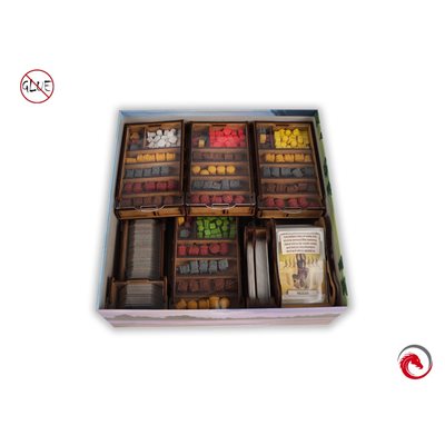 The insert is durable and made of high quality HDF and plexi-glass. To assemble it, there is no glue required. It allows to hold all components inside the box, including board, scenario book, map tiles and manual.
