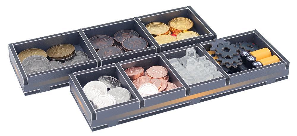 The insert is arranged in up to three layers with space on top for the boards. There are separate trays for the working & middle class workers, and all the resources are split by type making setup really fast. The coin token trays work equally well with the card or metal versions.