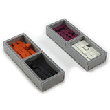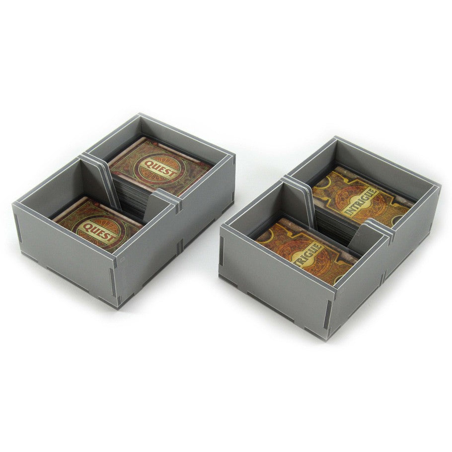 The trays allow for storage of each card type separately, as well as the building tiles. There are separate trays for each player, so they can take their colour pieces and use in-game. The adventurer cubes also all have separate slots to ease access.
