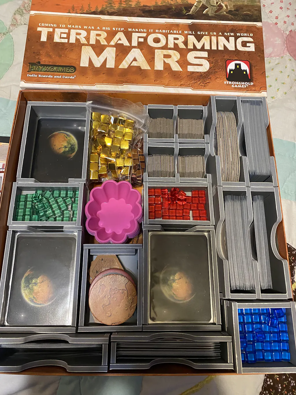 > Cube Holders - (This is where my exception comes in) Because the material is foam, it is not slick so it is more difficult removing player cubes and money cubes from their trays, because they do not easily slide. It sounds like such a little thing, but it really is a pain and does take up a lot more time for everyone trying to remove money cubes from the trays. We did end up dumping them onto the table anyways, which defeated the purpose of those trays. I have actually decided to remove the money cube trays from the box completely, and I am keeping those cubes in bags and using silicone muffin trays for play (as you will see in the photos). The player cubes, yes a pain to take out of the trays to use, but not such a big deal because you are generally only pulling one out occasionally and each player has their own tray.