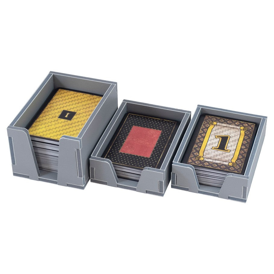 Insert compatible with Troyes®, and The Ladies of Troyes® expansion. The design provides both efficient storage and improved game play. Many of the trays can be utilized during the game, and they greatly aid set-up and clear-away times. The rules and boards act as a lid on top of the trays.