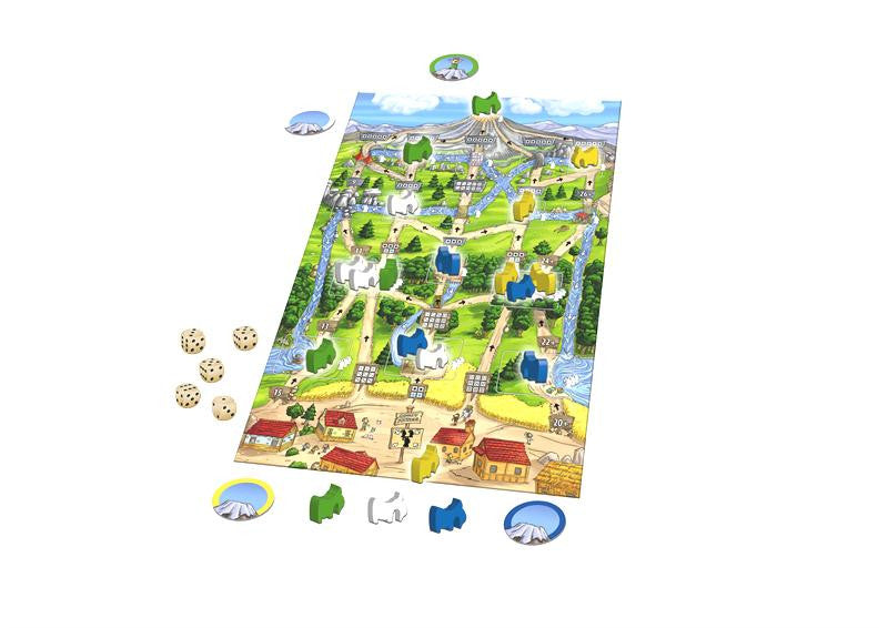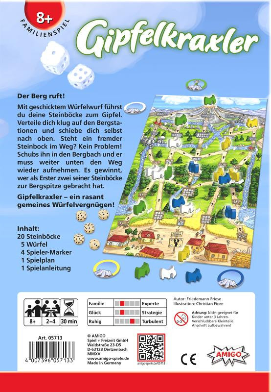Each path up the mountain has its own dice combination. The closer to the peak, the larger the required dice results (from three-of-a-kind and small straight to full house or five-of-a-kind), and the narrower the paths. In spaces of the upper half of the game board, there is room for only one mountain goat to stand. If you reach an occupied space, you may push one of your goats there one space toward the peak; on the other hand, you push one of your opponents' goats back toward the valley. Whoever can get two of their mountain goats to the summit first wins.