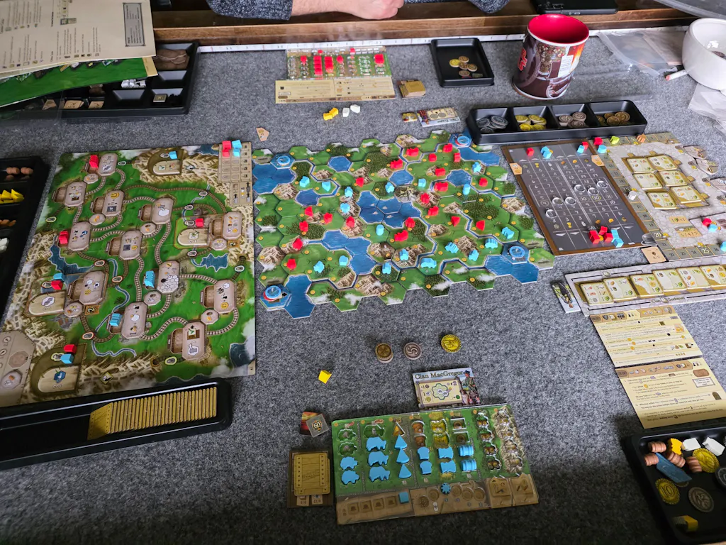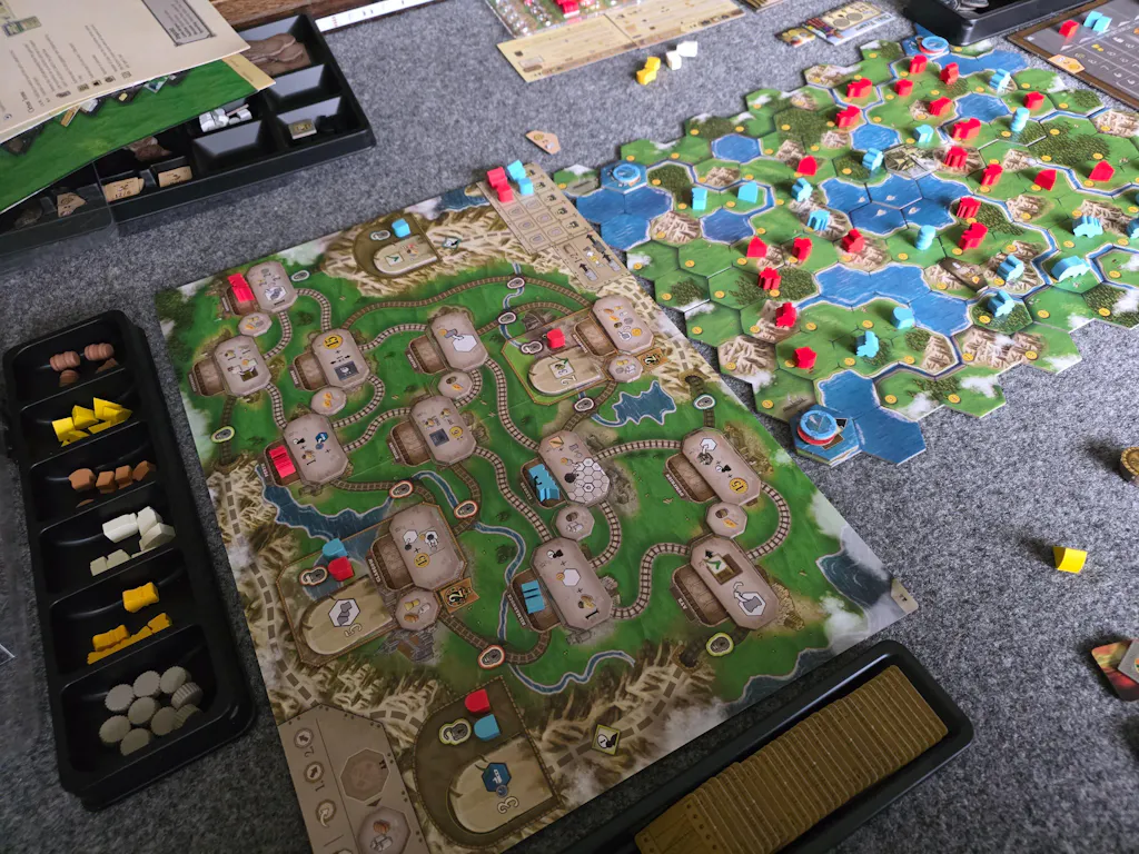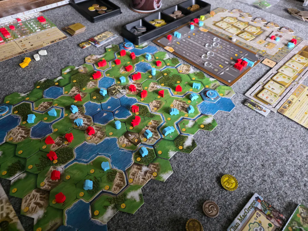 The game ends as soon as one player has claimed a certain number of buildings, then all players score the secret goal cards they received both at the start of and during the game. These cards may give points for majorities on peninsulas as well as for claiming certain types of buildings or collecting certain goods. The player with the most points wins.