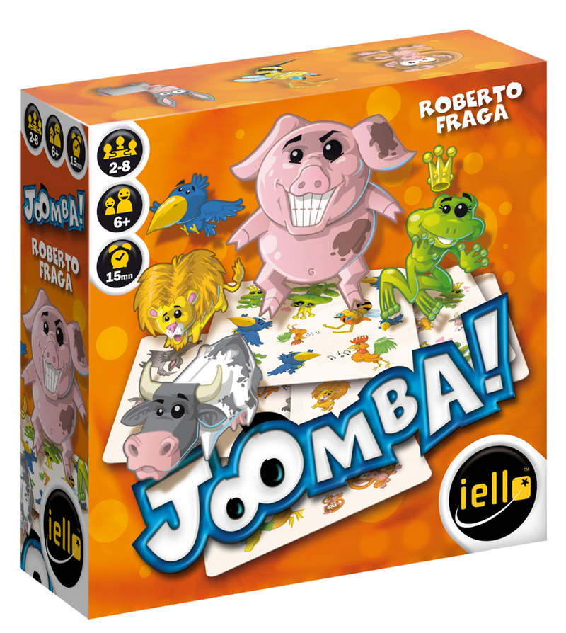 Joomba! is a simple party game in which players want to claim as many cards as possible. On a turn you reveal an animal card so that all players can see it; each card features four types of animals on it, with one animal type being present once, another being present twice, another three times, and the final type four times. Competing against everyone else, you must identify the animal that appears on the revealed card a number of times equal to the number on the back of the next card in the deck, then imitate the sound that animal makes.