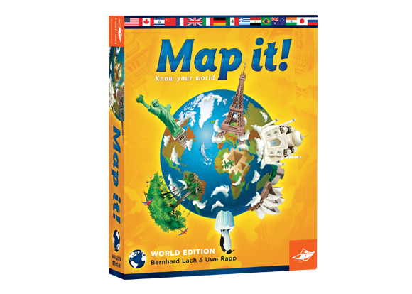 (aka, Map It! World Edition) uses the same game play as the other Ausgerechnet! titles: Players deal three piles of 15 location cards from a deck of roughly 200 cards (naming cities around the world for this edition), then place an interlude card between each set of piles to make a deck of 45 cards. One location card is placed on the direction board, which has arrows pointing north, south, east and west.