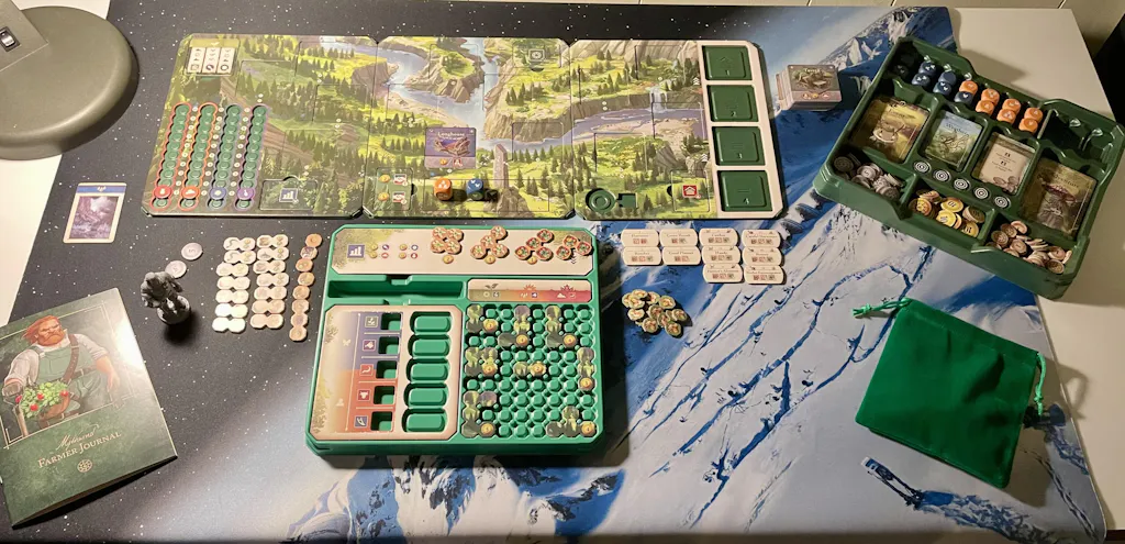 As an open-ended game, Mythwind has no distinct conclusion. Although many players may find a natural end point to their game at the conclusion of the story, players can continue to play the game for as long as they would like over as many game sessions as they wish. As players progress through the game, their town will develop and grow, reacting to changing seasons and to the members of the community over time. Progress made can be easily saved using the provided game trays, which offer a quick and easy solution for both tear-down of the current game and setup of future games.