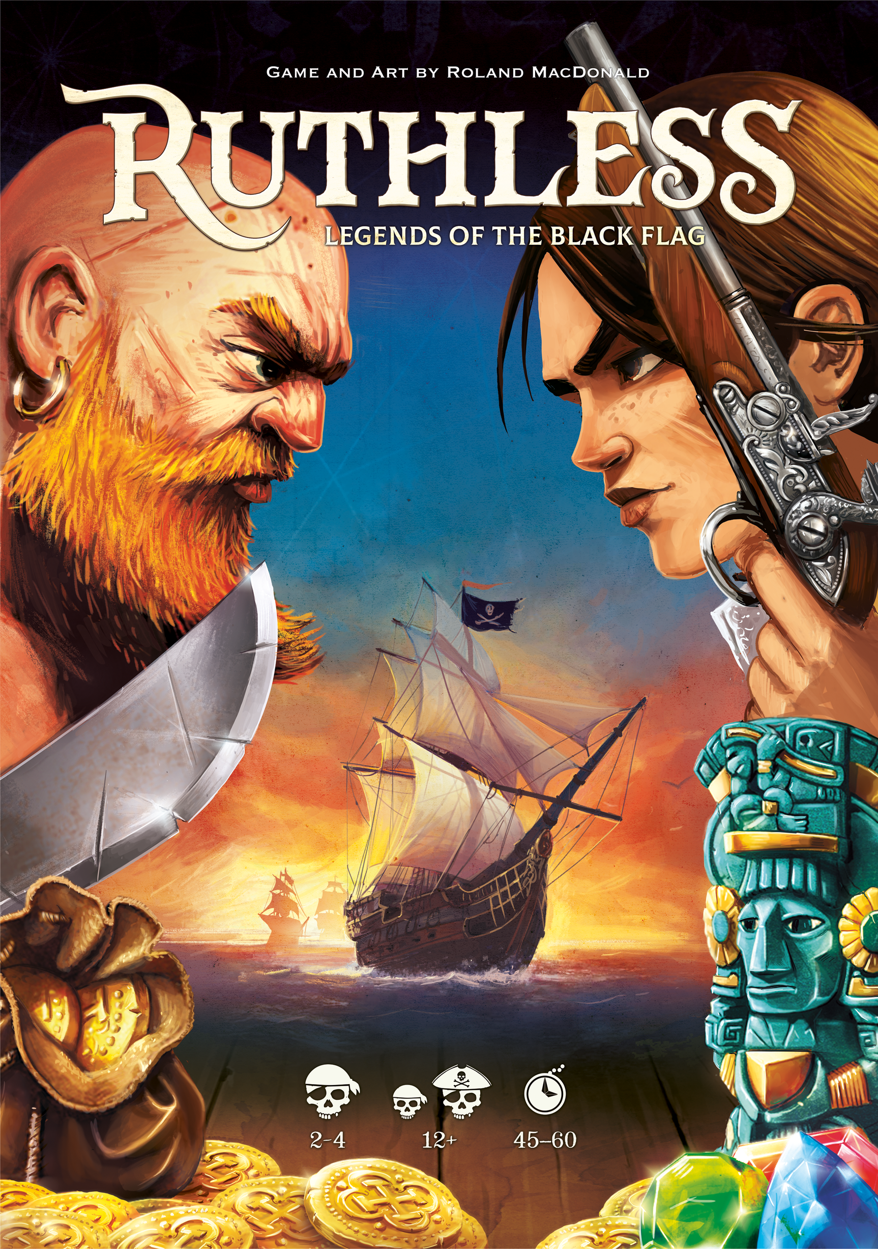 The primary mechanic of Ruthless is deck building. Every turn a player must play a card or set of cards from their hand after which they may buy new cards to their deck. The deck consists of pirate cards, which allow to attack opponent, draw more cards and perform many more profitable actions, and treasure cards which allow to buy more and better pirates. Treasures can be discarded immediately to acquire gold when needed or added to the deck to benefit repeatedly from their bonus. New crew members are laid out in front of the players and their effects are used at the moment of acquisition.