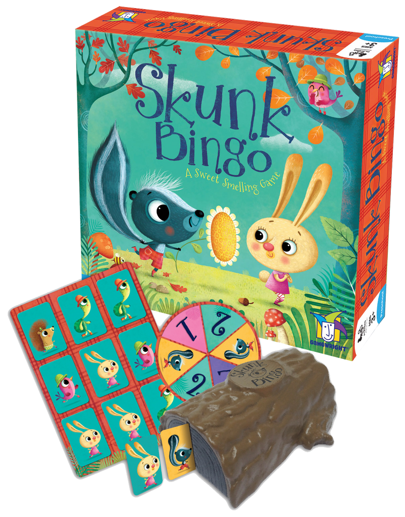 Line up for Skunk Bingo, a game of log jammin' fun! Spin the spinner, then place a creature into the log. If any pop out the other side, add them to your board. Don't let the skunk nose his way in line or else he's sure to make a stink! Be the first to fill your board and enjoy the sweet smell of victory.