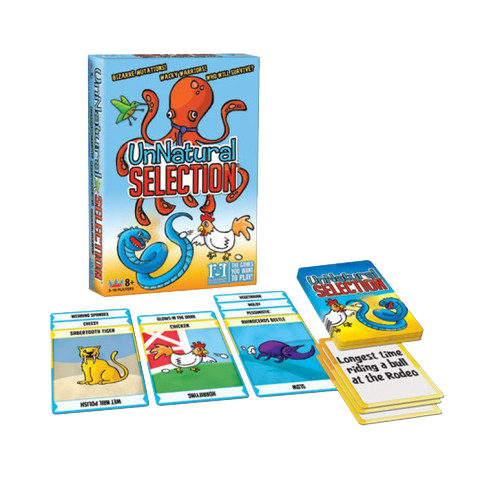 UnNatural Selection is an amusing tongue-in-cheek battle game in which you play creature cards to fight in an arena. Once the creatures are set to fight, you can play further cards to alter the abilities of your opponents in funny ways. The player judge for the round then selects a creature/attribute combination to win the match.